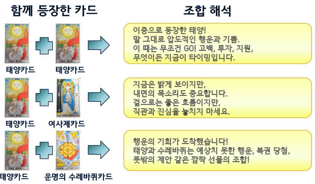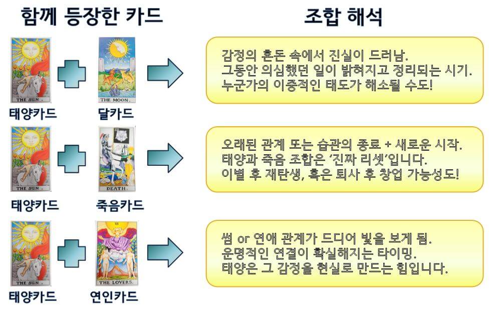 | 🌞 태양 (The Sun) + 태양 (2장) | 이중으로 등장한 태양! 말 그대로 압도적인 행운과 기쁨. 이 때는 무조건 GO! 고백, 투자, 지원, 무엇이든 지금이 타이밍입니다. |